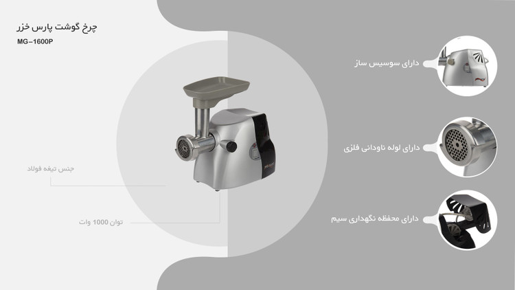 چرخ گوشت پارس خزر MG-1600P یک محصول مهم در آشپزخانه شما میتواند باشد که به کمک آن میتوانید گوشت و دیگر اقلامی که میخواهید را چرخ کنید. چرخ گوشت پارس خزر MG-1600P دارای ابعاد ۴۲۰ در ۱۸۰ در ۳۹۰ میلی متر است و ۵.۵ کیلوگرم وزن دارد. این چرخ گوشت دارای تیغهی فولادی است و با توان مصرفی ۱۰۰۰ وات، سرعت عمل بالایی دارد. به طوری که میتواند ۱۲۰۰ گرم گوشت یا هر چیز دیگری را در ۱ دقیقه چرخ کند. در نظر داشته باشید اگر قرار است حجم زیادی از گوشت را در یک نشست چرخ کنید، برای جلوگیری از فشار آمدن به دستگاه بهتر است بعد از هر ده دقیقه کار پیوسته، آن را برای دقایقی خاموش کنید که موتور چرخ گوشت استراحت کند. دیگر قابلیت چرخ گوشت پارس خزر مدل MG-1600P قابلیت سوسیسسازی این محصول است. از آنجا که خیلی از افراد به کیفیت سوسیسهای آمادهی بازار شک دارند، قابلیت سوسیس ساز چرخ گوشت این اجازه را میدهد که سوسیس خالص و سالمی آماده کنید. چرخ گوشت پارس خزر مدل MG-1600P همچنین دارای محفظه نگهداری سیم است بنابراین سیم دستگاه را بعد از استفاده جمع میکنید و فضایی اشغال نمیکند. پایههای ضدلغزش دستگاه نیز به شما این اطمینان را میدهد که چرخ گوشت روی سطح ثابت مانده و امکان واژگون شدن آن وجود ندارد.