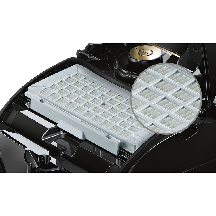 این جاروبرقی از سیستم مخزن زباله با پاکت نوع G بهره میبرد که یکی از پیشرفتهترین سیستمهای جمعآوری گرد و غبار در صنعت جاروبرقی است. این پاکتها با طراحی خاص خود، قابلیت نگهداری حجم بالایی از زباله را دارند و در عین حال از نشت گرد و غبار به محیط جلوگیری میکنند. سیستم فیلتراسیون قابل شستشوی این دستگاه، علاوه بر صرفهجویی اقتصادی، تضمینکننده تصفیه مؤثر هوای خروجی است. این فیلتر چند لایه با قابلیت جذب ذرات میکروسکوپی، آلرژنها و باکتریها، محیطی سالمتر را برای ساکنین فراهم میآورد. سیستم هشداردهنده تعویض کیسه گرد و غبار نیز با بهرهگیری از سنسورهای دقیق، زمان مناسب برای تعویض پاکت را اعلام میکند. این ویژگی از افت کارایی دستگاه جلوگیری کرده و عمر موتور را افزایش میدهد.
