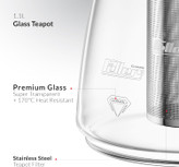 - قوری شیشهای شفاف مقاوم در برابر دمای تا حدود ۱۷۰ درجه سانتیگراد