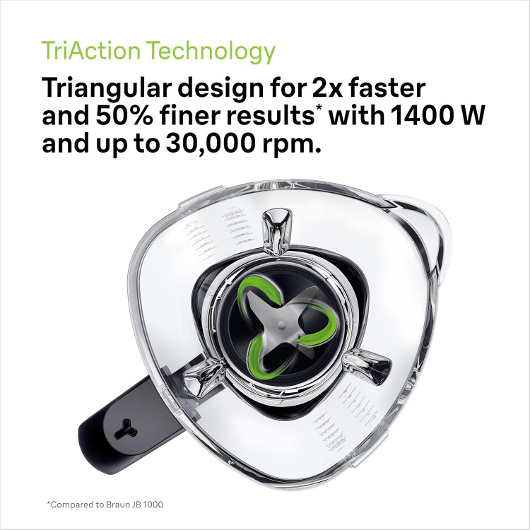 - فناوری TriAction: پارچ مثلثی شکل طراحی شده است تا مواد را سریعتر به قسمت برش دستگاه بازگرداند؛ این کار باعث میشود عملکرد مخلوطکن تا دو برابر سریعتر شده و نتایجی یکنواختتر داشته باشد.