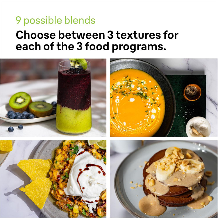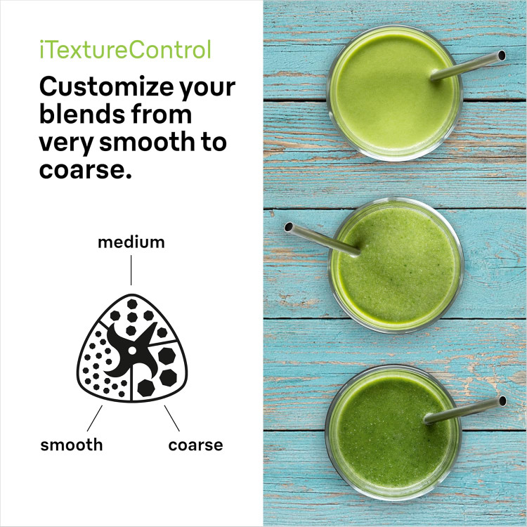 - iTextureControl با ۹ برنامه غذایی و سه بافت متفاوت (نرم، متوسط و درشت): امکان انتخاب دقیق بافت نهایی غذا یا نوشیدنی شما، با سه مرحله ساده: انتخاب برنامه، تعیین بافت، فشار دادن دکمه شروع.
