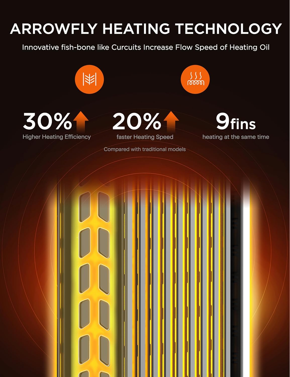 این رادیاتور با توان ۲۰۰۰ وات قادر است فضای موردنظر را در مدتزمان کوتاهی گرم کند. وجود ۹ پره روغنی پرحجم باعث میشود گرما بهصورت یکنواخت در محیط منتشر شود و دما در همه نقاط اتاق ثابت بماند.
