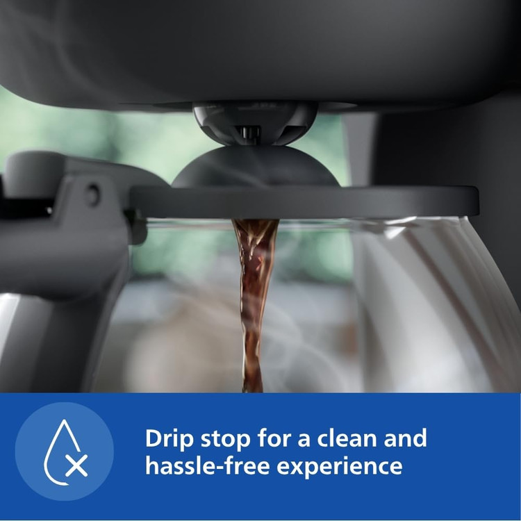 قابلیت Drip Stop (ضدچکه) از دیگر امکانات کاربردی HD7430/90 است که به شما اجازه میدهد پیش از اتمام کامل فرآیند دمآوری یک فنجان قهوه بردارید بدون آنکه قطرهای روی بدنه یا صفحه دمنشیند. همچنین نشانگر سطح آب در کنار دستگاه، پر کردن مخزن را ساده و دقیق میسازد تا همیشه بهمقدار مناسب آب بریزید.
