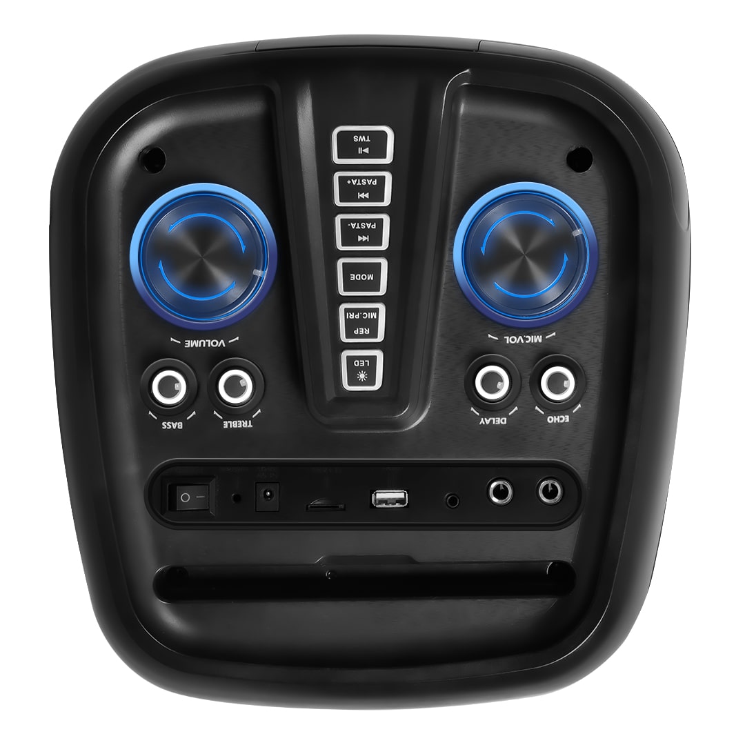 پارتی باکس مدل TS 1905 از برند تسکو پارتی باکس TS 1905 در 57.5*24*28 سانتی متر سانتی متر و وزن 6.3 کیلوگرم در رنگ مشکی طراحی و تولید شده است،در قسمت بالایی این اسپیکر پنل تنظیمات اسپیکر تعبیه شده که شامل دکمه های پاور، تغییر حالت نورپردازی LED ها، تنظیم ولوم، تعویض آهنگ، قابلیت TWS، قابلیت ضبط صدا، ورودی های میکروفن، پورت USB و نمایشگر LED است.