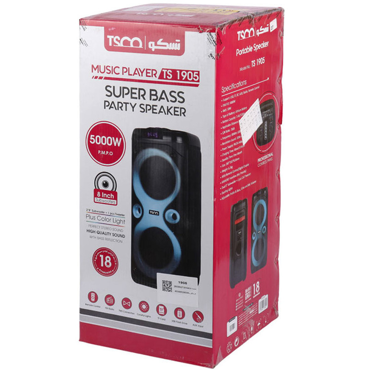 این پارتی باکس با قدرت تفکیک صدای 30hz_20khz، دامنه فرکانس 88mhz_108mhz، توان واقعی 30 وات، وضوح صدای 78db و نورپردازی های RGB جذاب یکی از با کیفیت ترین پارتی باکس های برند تسکو به شمار می اید.از اقلام همراه پارتی باکس TS 1905 میتوان به ریموت کنترل،میکروفن بی سیم و آداپتور اشاره کرد.