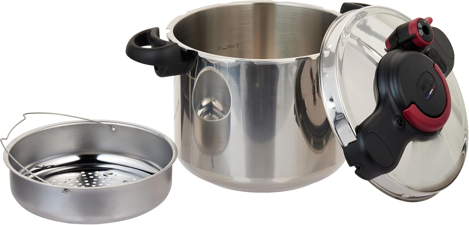 یکی از ظروف پخت وپز بسیار مهم در هر خانه و آشپزخانه، زودپز است. در واقع وقتی که یک مهمان ناخوانده برای شما می آید و وقت کمی برای درست کردن غذا دارید بهترین انتخاب برای سرعت درست کردن غذا زودپز است. زودپز با آزاد نکردن بخار آب درون محفظه خود، فشار را بالا می برد. این باعث می شود آب در دمای بالاتری بجوشد و این دمای بالاتر باعث می شود که غذا سریع تر بپزد. البته زودپز خواص های دیگری هم دارد که یکی دیگر ویژگی های زودپز می توان به خوش طعم ماندن غذا و حفظ خواص آن اشاره کرد. زودپز 9 لیتری Tefal (تفال) مدل Clipso Minut Easy با پوششی ضخیم و ضد زنگ غذاهای شما را 2 برابر سریع تر از حالت معمول آماده می سازد. زودپز تفال دارای یک سبد بخارپز تمام استیل بوده و به شما این امکان را می دهد که با قرار دادن سبد درون زودپز خیلی سریع غذایی سالم و سرشار از ویتامین را بخارپز کنید. که این ویژگی برای افرادی که رژیم دارند و به سلامت موادغذایی خود اهمیت می دهند بسیار مناسب است. این زودپز با 5 سیستم امنیتی که دارد شما را از نگرانی خارج نشدن بخار و منفجر شدن زودپز راحت می کند. درپوش این زودپز به گونه ای طراحی شده است که شما تنها با یک دست به سادگی در زودپز را باز و بسته می کنید. همچنین می توان این زودپز را در ماشین ظرفشویی نیز شست.